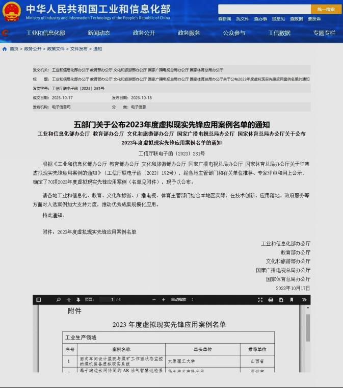 10月17日,工业和信息化部、教育部、文化和旅游部、国家广播电视总局、国家体育总局等五部委办公厅公布2023年度虚拟现实先锋应用案例,我院王学文教授团队完成的“面向车间设计装配与煤矿工作面状态监控的煤机装备虚拟现实系统”经工信部组织评审,成功入选案例名单。