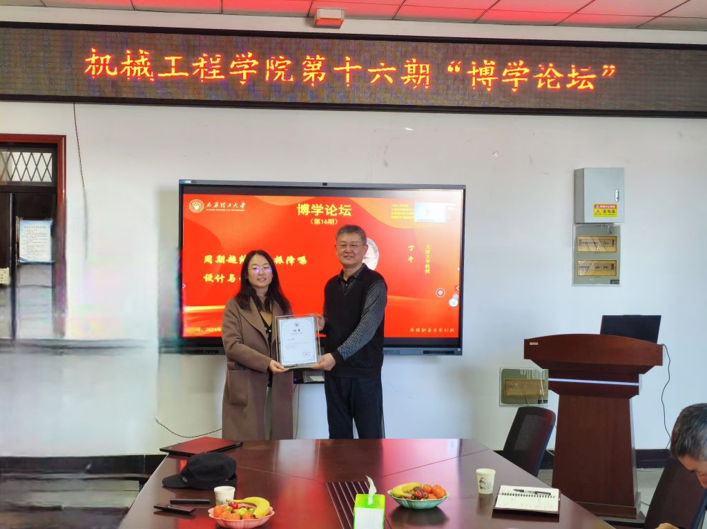 最后,庞新宇教授为丁千教授颁发了证书。本次论坛讲座有助于提升学院的科研水平和学术视野,营造良好的学术氛围,为全院师生提供更广阔的交流学习平台。