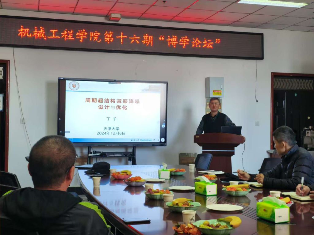 2024年12月6日,bwin必赢中国官网特邀天津大学bwin必赢中国官网丁千教授在逸夫楼505会议室做了题为“周期超结构减振降噪设计与优化”的学术报告。这是学院“博学论坛”系列学术报告的第16期。会议由李国兴副教授主持。学院科研骨干教师、部分博硕士研究生约40人参加报告会。