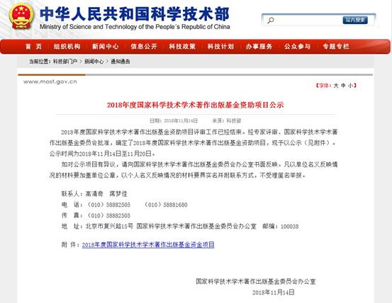 我院一项目获2018年国家科学技术学术著作出版基金资助