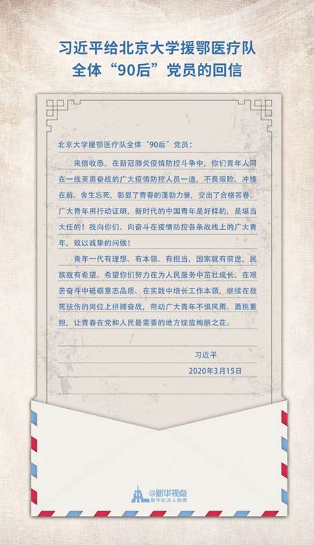 中共中央总书记、国家主席、中央军委主席习近平3月15日给北京大学援鄂医疗队全体“90后”党员回信,向他们和奋斗在疫情防控各条战线上的广大青年致以诚挚的问候。我院迅速组织学院青年学习习近平总书记的回信,回信精神在我院青年中引发强烈反响。
