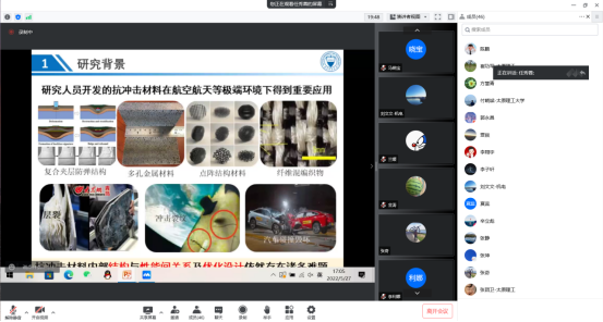 会上,葛磊首先介绍了与会领导和专家,宣布会议开始。三位青年教师张志雄、李永存、张东光副教授分别以“电场辅助波平轧制钛合金组织调控与强韧化机理”、“抗冲击材料内部损伤快速演化的4D动态原位实验与仿生轻量化设计”、“仿蚯蚓体表呼吸与触觉机制的氢堆气体泄漏多源感知机理研究”为题进行了精彩的呈现和汇报。