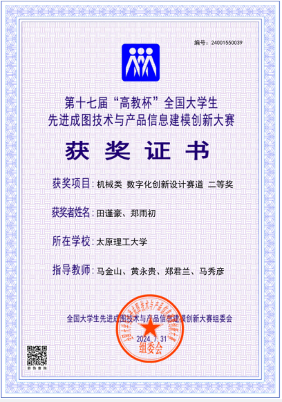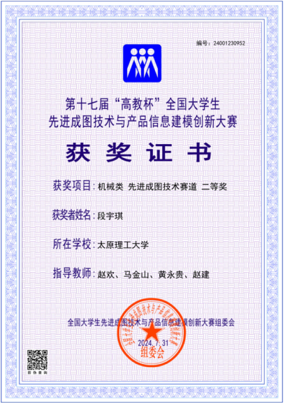 我院学子荣获机械类团体二等奖1项、数字化创新设计赛道二等奖1项、增材制造赛道二等奖1项、先进成图技术赛道二等奖1项、先进成图技术赛道三等奖3项、轻量化设计赛道三等奖1项。5位工程图学教师获得机械类优秀指导教师奖。