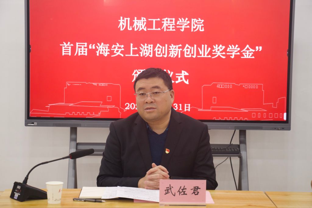 在总结发言中,武佐君书记对获奖学生表示了热烈的祝贺,对韩建超老师及所有为奖学金设立付出努力的人员表示了衷心的感谢。他强调,创新创业是社会发展重要趋势,也是培养高素质工程技术人才的关键。学院将加强与海安市上湖创新区在科研合作、实践教学、学生培养等方面的交流合作,深化产学研融合,为学生提供更多创新创业机会。希望同学们珍惜荣誉,再接再厉,用知识推动社会进步,用实践助力国家发展。