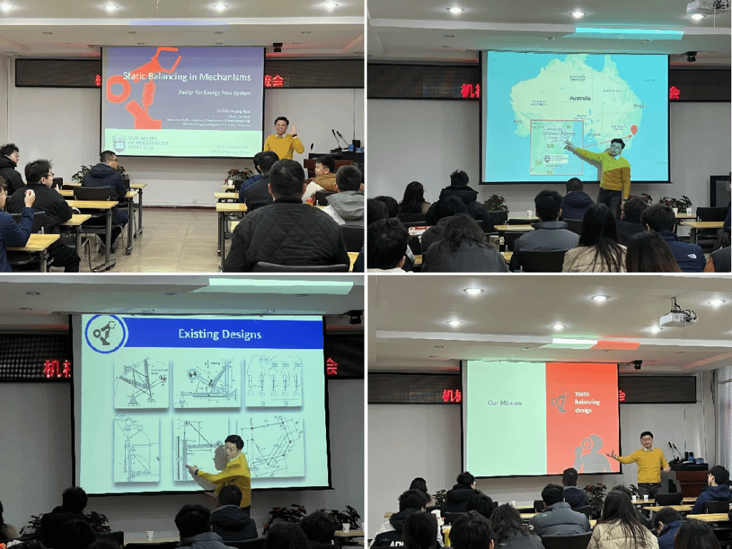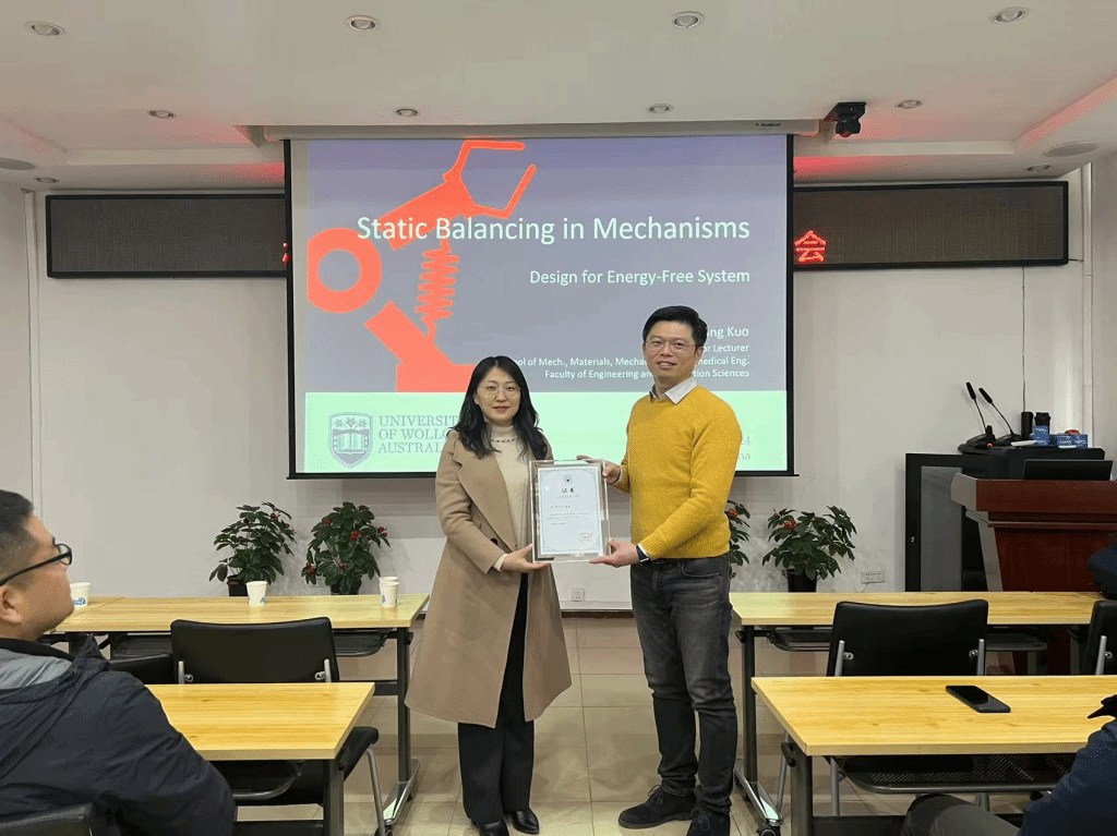 丁华介绍了Chin-Hsing Kuo教授的个人学术简历,并代表学院对Chin-Hsing Kuo教授的到来表示热烈欢迎。Chin-Hsing Kuo教授是澳大利亚伍伦贡大学机械工程学术项目主任,在机械、材料和生物医学工程等多个学院授课,是美国机械工程学会会员、ASME机器人委员会主席、ASME Journal of Mechanism and Robotics高级编辑,研究方向是机器人系统设计与开发。报告会中,Chin-Hsing Kuo教授对机构设计平衡领域的研究内容进行介绍,重点介绍了机构运动中静力平衡的相关研究,并分享了自己在台湾的科研教育背景以及与澳大利亚企业深入合作交流的工作经历。Chin-Hsing Kuo教授对机械手臂不同的应用场景进行举例,详细展示了各个机构的设计图,提出机构设计最关键的问题在于创新。讲座过程中的问答环节,Chin-Hsing Kuo教授与参会教师和学生进行了深入的学术交流,并一一解答教师和同学们提出的问题。