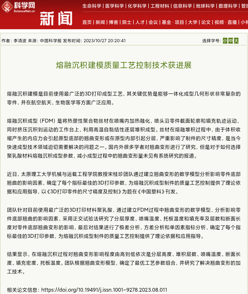 近日,太原理工大学机械与运载工程学院教授宋桂珍团队通过建立翘曲变形的数学模型分析影响零件底部翘曲的影响因素,确定了每个指标最佳的3D打印参数,为熔融沉积成型制件的质量工艺控制提供了理论依据和应用指导,以《3D打印零件的尺寸精度及控制》为题在《中国塑料》刊发。