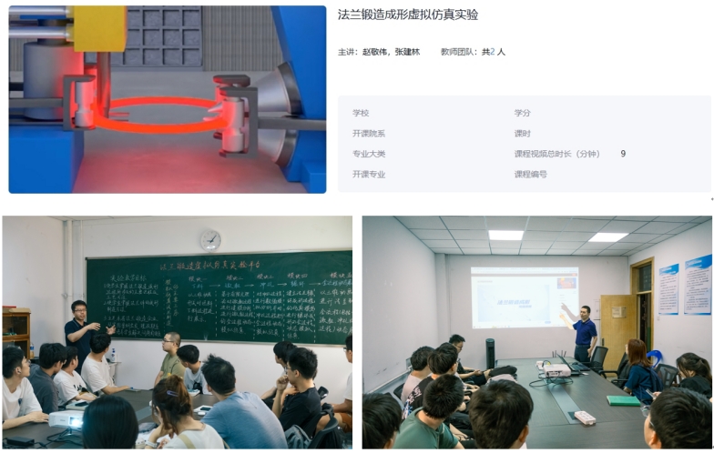 围绕高端装备制造山西省重点产业链以及定襄法兰省级重点专业镇建设,《金属工艺学及工程材料》课程团队在校企合作的基础上,与法兰制造企业共同建设了法兰锻造成形虚拟仿真实验平台(https://mooc1.chaoxing.com/course-ans/courseportal/243922800.html)。该实验平台以企业的实际生产工艺流程为基础,主要包括下料、镦粗、冲孔、辗环等模块,模拟仿真法兰制造的主要成形工序,并结合动画演示、生产现场视频等,有效地将法兰的实际生产流程引入到本科课程的教学中。与课程中其他的理论知识教学和常规实验虚实结合,以虚补实、以虚拓实,解决了传统综合实验课程新颖性和前沿性不足的问题。